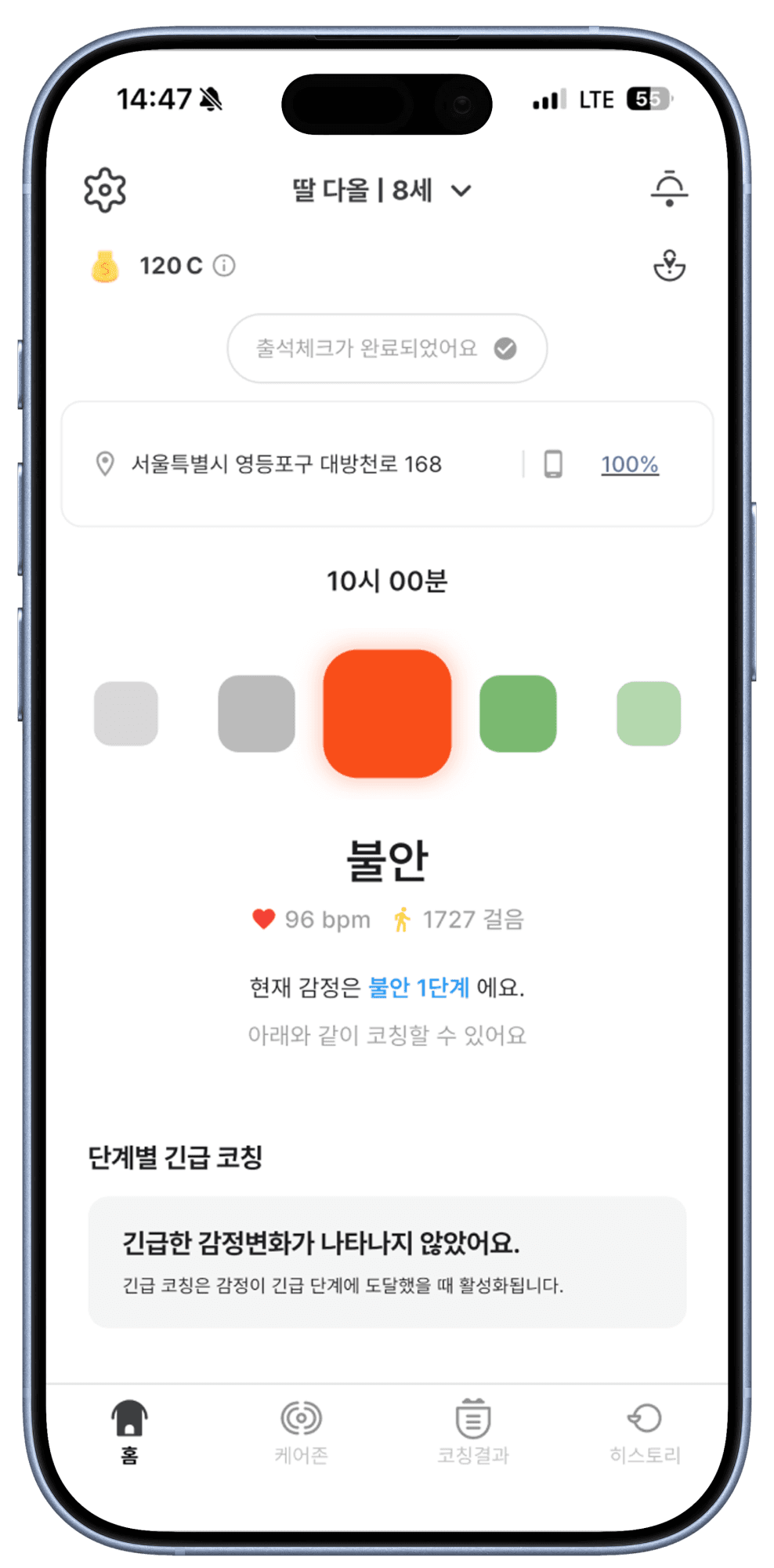 아이의 정서 상태(안정, 긴장, 불안)를 과학적으로 추정해 제공합니다.
