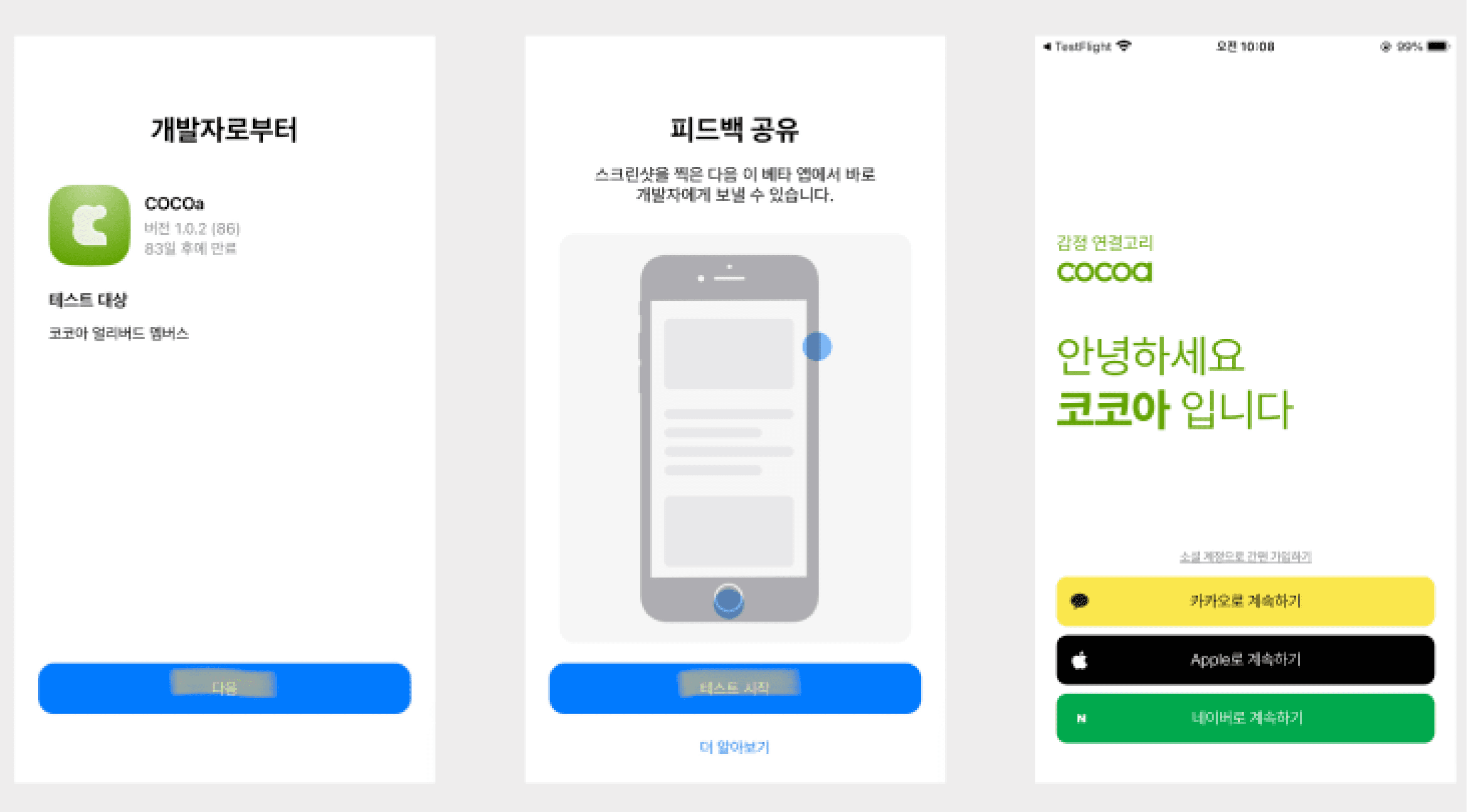 'TestFlight'를 통해 코코아 앱을 설치하게 됩니다. 아래 3단계를 차례대로 진행해 주세요.