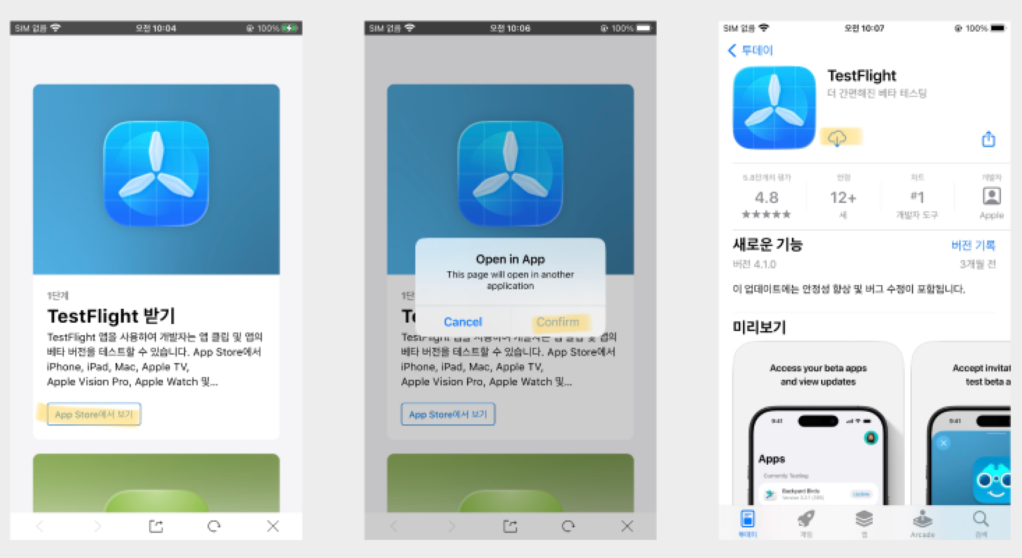 TestFlight 설치가 끝났다면, 다시 원래의 설치 안내 페이지로 돌아와